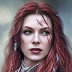 Die Frau vor euch ist groß und kräftig von Statur. Sie hat lange rote Haare, die teilweise zu Zöpfen geflochten sind und einige von ihnen werden zudem von silbernen Perlen geziert. Ihre Haut ist hell und lässt vermuten, dass sie aus nördlicheren Gefilden stammt. Ebenso wie ihre Kleidung und Rüstung, die aus einem Kettenpanzer besteht, der teilweise zusätzlich mit Leder und Fellen besetzt und unterfüttert ist. Ein Anhänger zeigt sich an ihrer Rüstung. Er hat die Form eines aggressiven Wolfskopfes.
