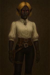 Diese kleine Gestalt ist auf den ersten Blick nur schwer als eindeutig weiblich oder männlich einzuordnen... doch die schwarze Haut macht recht deutlich klar, was man vor sich hat: Drow! Das Haar ist gelblich-weiß, und die Gestalt an sich ist schmal und sehnig. Was jedoch vor allem auffällt ist dass ihr Gesicht, ihre Arme, ja, jedes bisschen Haut, welches zu sehen ist, mit rötlichen, verschlungenen Linien übersät, und Körperschmuck ist an Augenbrauen, Nase, Lippe und vor allem Ohren angebracht, was jedoch meist eher verstörend als Interessant wirken dürfte. Ihr Gesicht ist scharf geschnitten, und von ovaler Form, jedoch mit einem spitzen Kinn. Ihre Wangenknochen sind hoch, die Nase eher klein. | Diese kleine Gestalt ist auf den ersten Blick nur schwer als eindeutig weiblich oder männlich einzuordnen... doch die schwarze Haut macht recht deutlich klar, was man vor sich hat: Drow! Das Haar ist gelblich-weiß, und die Gestalt an sich ist schmal und sehnig. Was jedoch vor allem auffällt ist dass ihr Gesicht, ihre Arme, ja, jedes bisschen Haut, welches zu sehen ist, mit rötlichen, verschlungenen Linien übersät, und Körperschmuck ist an Augenbrauen, Nase, Lippe und vor allem Ohren angebracht, was jedoch meist eher verstörend als Interessant wirken dürfte. Ihr Gesicht ist scharf geschnitten, und von ovaler Form, jedoch mit einem spitzen Kinn. Ihre Wangenknochen sind hoch, die Nase eher klein. | ||