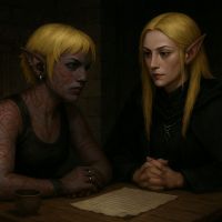 | Rauvyls erste Begegnung mit Ameng war eher unangenehm. Mit jedem Wort, jeder Geste und jedem Teil ihrer Mimik zeigte die Sonnenelfe, dass sie sich der Dunkelelfe überlegen fühlte. Ihr ganzes Verhalten brachte Rauvyl vollkommen gegen sie auf, zusätzlich zu dem Fakt, dass sie als Feenelfe so oder so der Erzfeind der Drow war. Doch auch wenn Ameng meistens arrogant und abweisend wirkte, versuchte sie Rauvyl meistens eher zu helfen. Aber nachdem Ameng eine Erfahrung mit einem Ghaunadaur-Dämon hatte, wirkte sie viel bescheidener... und spätestens nach Rauvyls Zeit im Koma, konnte sich zögerlich und langsam eine vorsichtige Freundschaft entwickeln. Und nach Rauvyls Konvertierung zu Eilistraee ist das Verhältnis deutlich besser geworden. | Faeanshalee und Rauvyl hatten eine sehr gemischte Vergangenheit. Als sie sich kennenlernten war sie noch ein Mann mit dem Namen Faern und bedrohte sie mit dem Leben. Erst später änderte er seine Meinung, und die beiden kamen sich näher. Doch kurz bevor sich mehr entwickeln konnte, wurde aus ihm wieder Faeanshalee. Dennoch kamen sie sich näher, und Rauvyl erfuhr von ihr viel über Eilistraee, auch wenn sie sehr skeptisch blieb. Später kümmerte sie sich um Rauvyls Körper, als sie im Koma lag nach der Besessenheit des Panzerhandschuhs, und noch später opferte sie ihren Wunsch, um Rauvyl ein neues Leben zu schenken, nachdem Rauvyl es opferte, um den Sternenreisenden zu vernichten. Auch wenn Rauvyl dies oft eher bissig kommentierte, war sie dennoch schon beeindruckt von dem, was sie bereit war zu opfern. Danach war ihre Verbindung irgendwie nicht mehr dasselbe. | Nadia war Rauvyls Lehrmeisterin in ihrer eher schurkischen Ausbildung. Schlösser, Fallen, die Wege durch die Stadt und über die Dächer und die Bindung zu den Schatten, all das hat sie Nadia zu verdanken. Und den Unterschlupf in Neu-Rivin. | |||